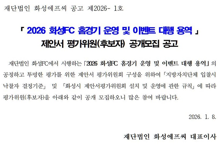 [제안서 평가위원 후보자 공개모집 공고] 2026 화성FC 홈경기 운영 및 이벤트 대행 용역