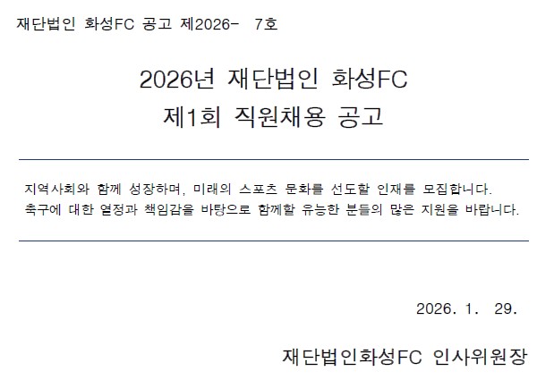 2026년 재단법인 화성FC 제1회 직원 채용 공고