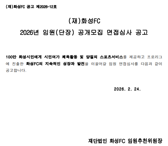 (재)화성FC 2026년 임원(단장) 공개모집 면접심사 공고