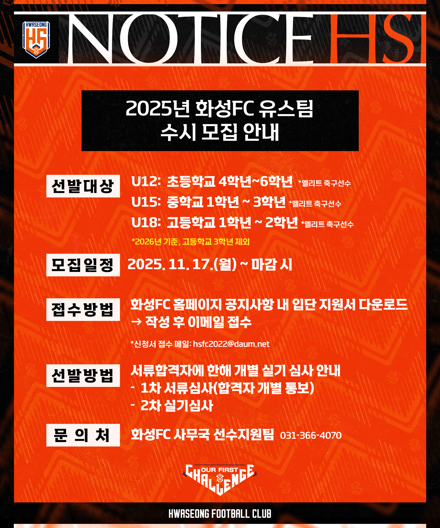 2025년 화성FC 유스팀(12세, 15세, 18세) 수시 모집 안내
