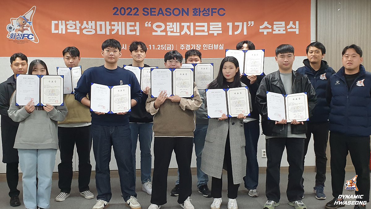 [화성FC 미디어(화성)=한규빈 미디어오피서] 화성FC는 지난 25일 화성종합경기타운 주경기장 인터뷰실에서 대학생 마케터 ‘오렌지크루’ 1기 수료식을 열고 한 시즌 간의 활동을 마무리했다.